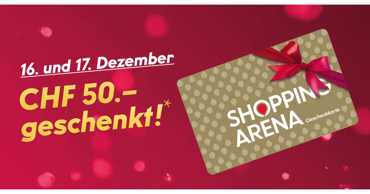 *Beim Kauf einer Shopping Arena Geschenkkarte im Wert von CHF 200.– schenken wir Dir CHF 50.– dazu. Diese werden direkt auf die gekaufte Geschenkkarte geladen. Das Angebot kann 1x pro Person (Mindestalter 14 Jahre) am Infopoint in der Shopping Arena eingelöst werden. Stückelungen sind nicht möglich. Nicht kumulierbar. Gültig von 16.-17.12.2025. Einlösung im Online-Shop nicht möglich. Die Shopping Arena behält sich das Recht vor, die Aktion abzubrechen, falls ein Missbrauch vorliegt. Gültig solange Vorrat.